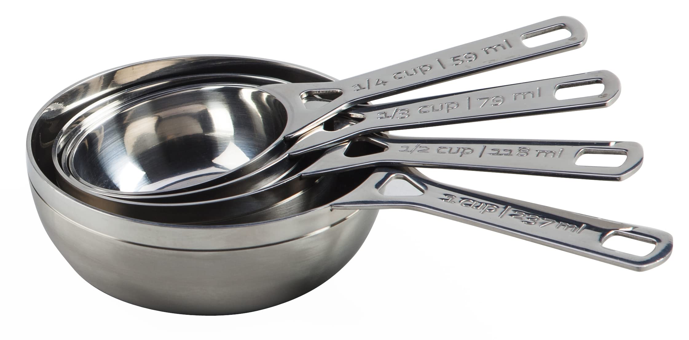 - 4 piece set includes: 1/4, 1/3, 1/2, and 1 cup sizes